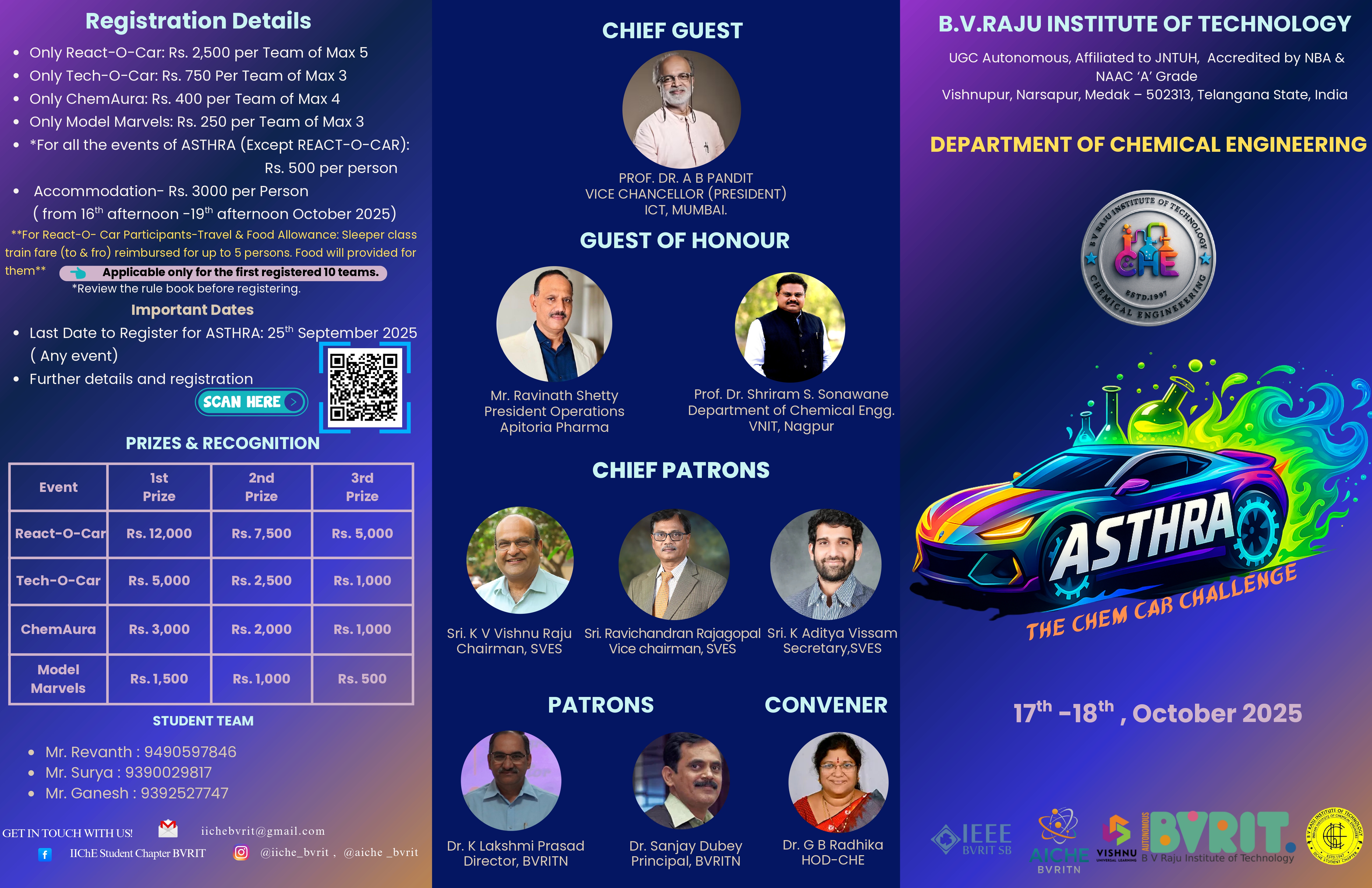 ASTHRA was a two-day National Level REACT-O-CAR Competition, envisioned as the flagship event to ignite innovation, creativity, and collaboration among students from diverse engineering disciplines. At its core, the REACT-O-CAR competition challenges participants to design and fabricate chemically powered cars, evaluating not only their technical knowledge but also their precision, problem-solving ability, and innovative mindset. This high-energy challenge stands as a true test of engineering ingenuity, blending chemical principles with practical application. Alongside the REACT-O-CAR challenge, ASTHRA also hosts a vibrant array of events and knowledge-sharing sessions, including: Tech-o-Car – innovative model car design challenges, Chem Aura – a multi-round technical event, Model Marvels creative model-making. To enrich the experience, keynote lectures by eminent experts will deliver thought-provoking insights into the latest advancements, while cultural and networking activities provide opportunities for collaboration and interaction beyond academics. With its unique balance of competitive rigor, technical depth, and collaborative learning, ASTHRA establishes REACT-O-CAR as its flagship attraction, inspiring participants to push boundaries and redefine innovation in chemical engineering.