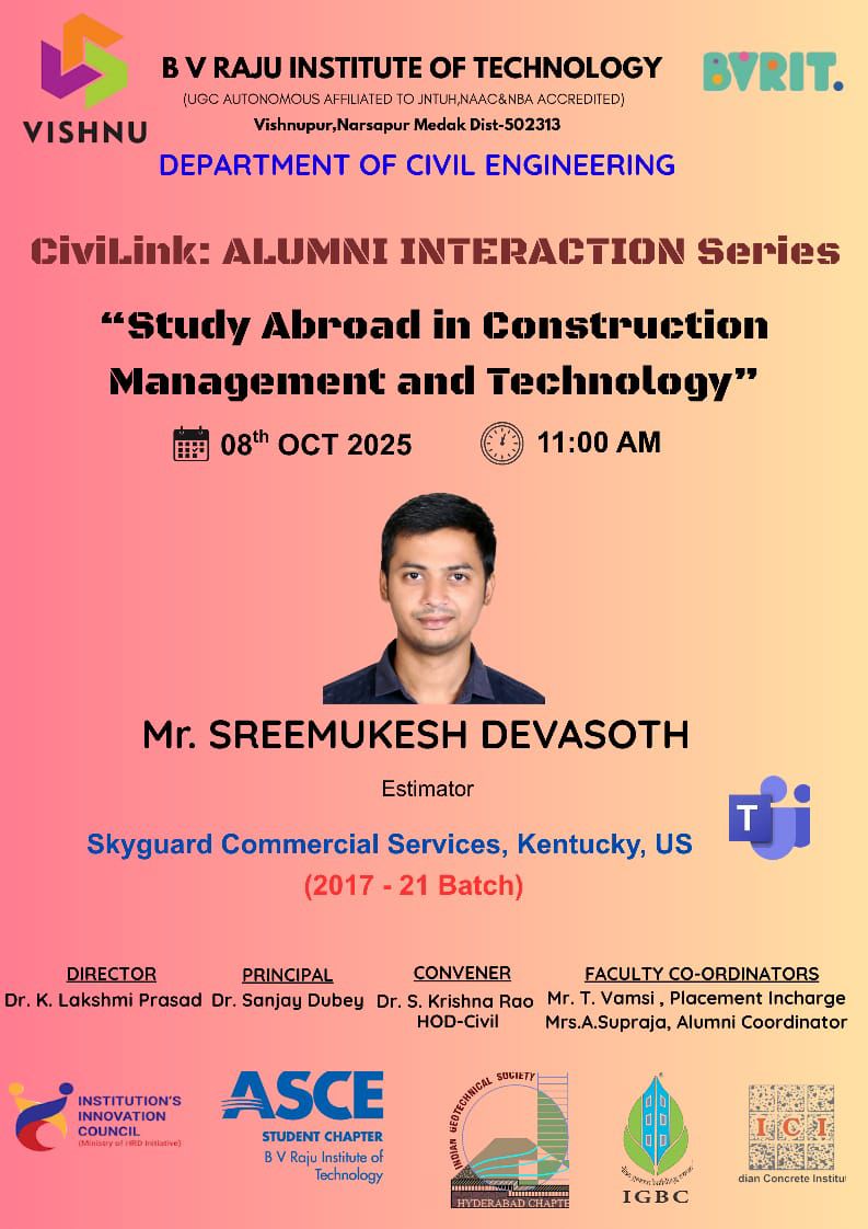 Greetings from the Department of Civil Engineering at B. V. Raju Institute of Technology, located in Narsapur, Telangana. Our journey began in 2012, and throughout the past decade, we have flourished in both expertise and competency within the fundamental disciplines of civil engineering and research.