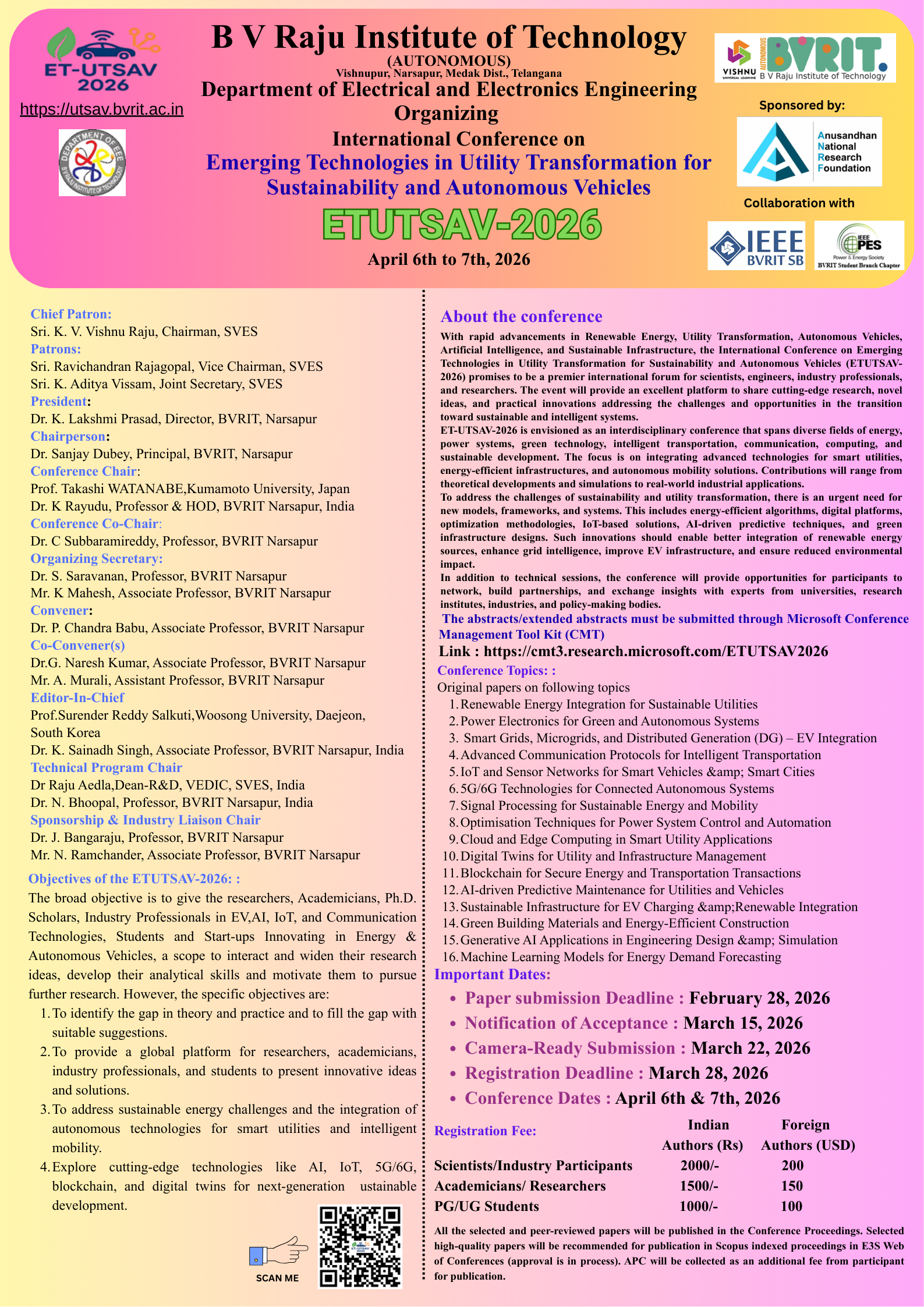 Department of Electrical and Electronics Engineering (EEE), in association with BVRIT IEEE Student Branch (SB) and IEEE Power & Energy Society (PES), is pleased to invite researchers, academicians, industry professionals, and students to participate in the International Conference on “Emerging Technologies in Utility Transformation for Sustainability and Autonomous Vehicles (ETUTSAV–2026)” scheduled on April 6th & 7th, 2026, at ELN Seminar Hall–1, B V Raju Institute of Technology (Autonomous), Narsapur, Telangana.