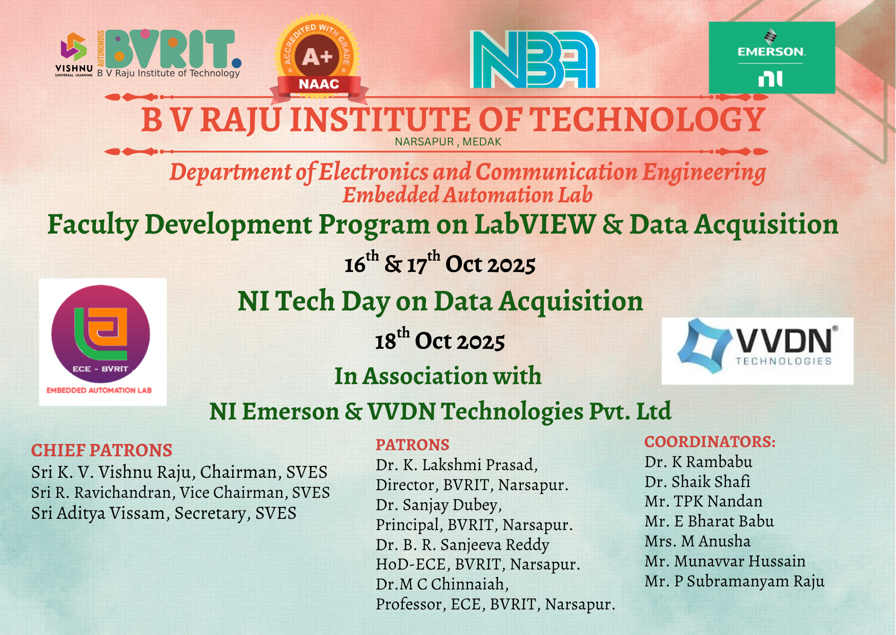 Dept. of ECE: A 3-Day Faculty Development Program including NI Tech Day on “LabVIEW & Data Acquisition”, in collaboration with NI Emerson and VVDN Technologies Pvt. Ltd., scheduled from 16th to 18th October 2025.