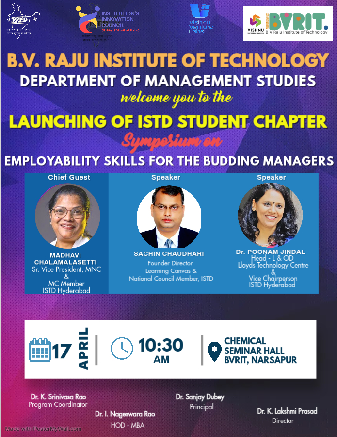 Dept. of Management Studies: Inaugurating a ISTD student chapter and organizing a symposium on employability skills for the budding managers in collaboration with the ISTD Hyderabad Chapter on 17-04-2025.