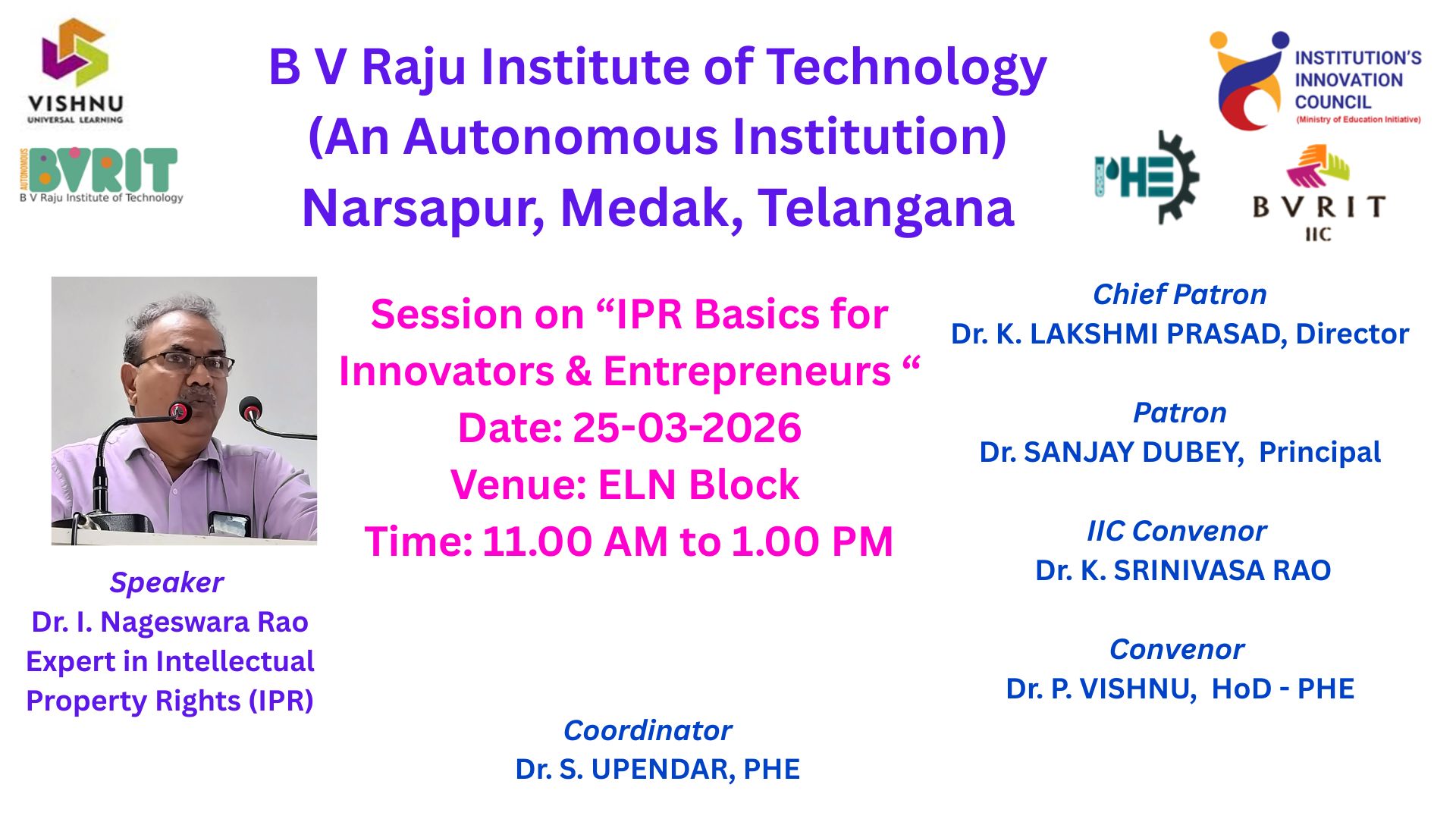 conducted a seminar on 25th March 2026 from 11 AM to 1 PM. through IIC on the topic of " IPR Basics for Innovators & Entrepreneurs ".