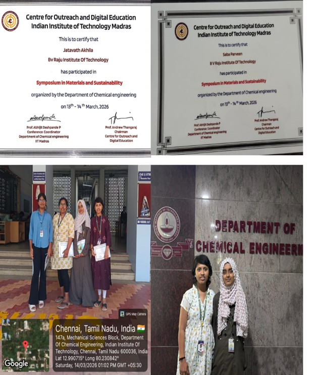 4 students Lalitha madhuri (22211a3118) & Srivalli (22211A3116) from final year and J.akhila(23211A3133)& saba parveen (23211A3158) from third years went to IIT madras for Outreach for UG students – Chem Eng programme during 13, 14 of March 2026. at IIT Madras Research Symposium and Outreach Programme (MATSUS 2026)