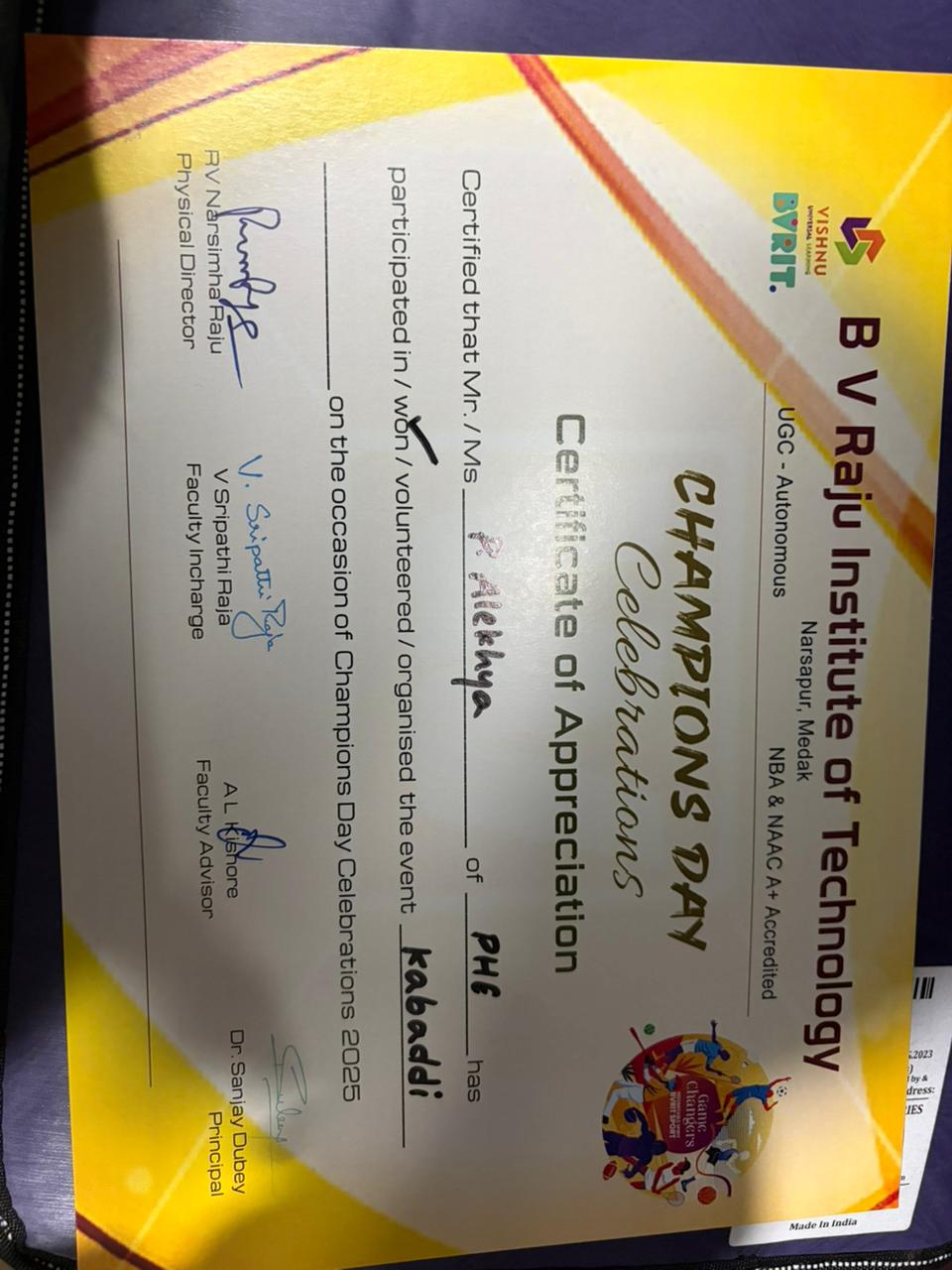 2322A3150 Pittla Alekhya participated in KHO-KHO and Khabbadi on the eve of Champion day celebrations at B.V>Raju institut eof Technology